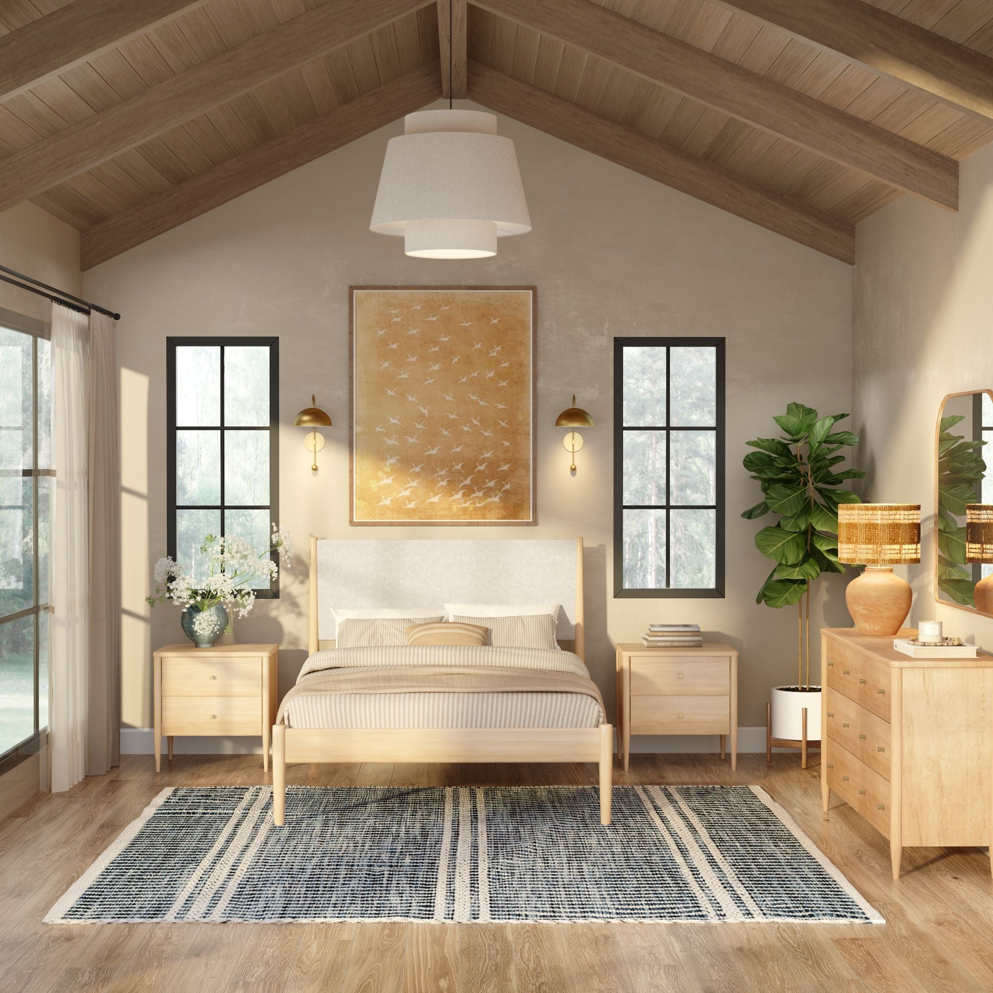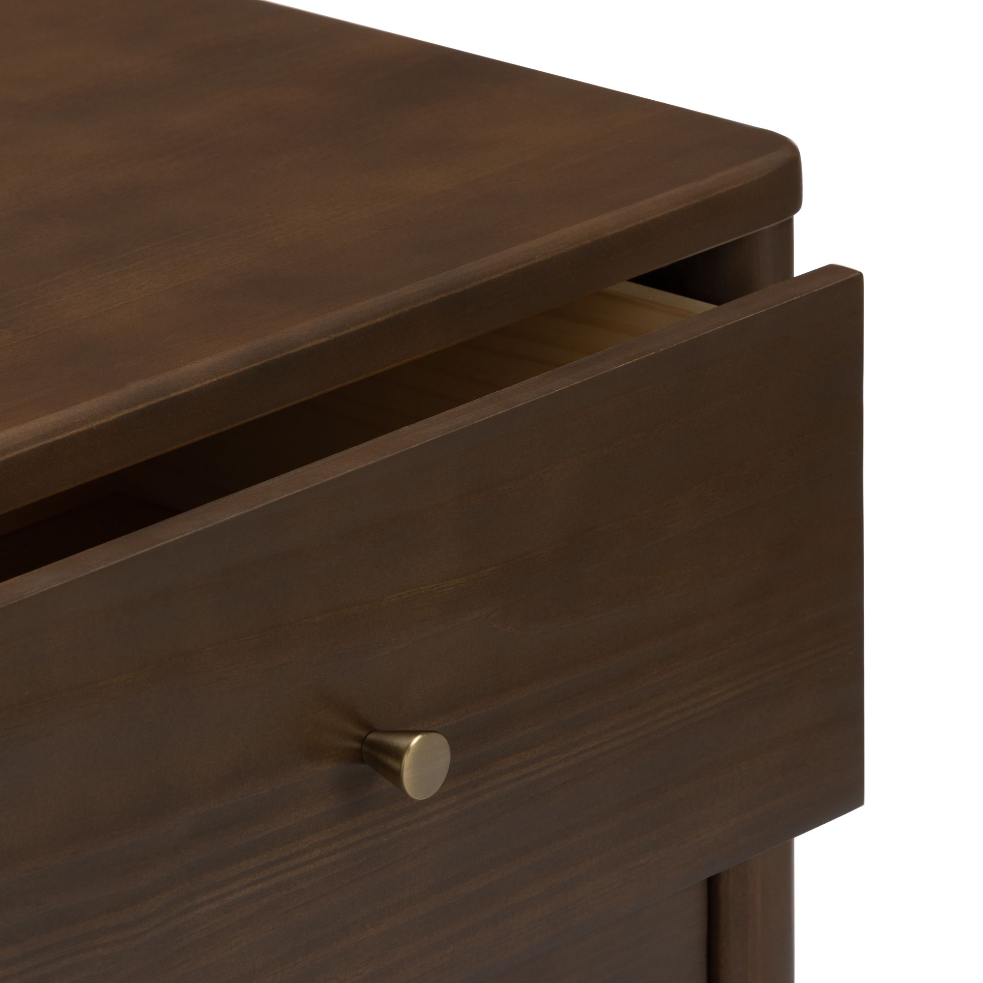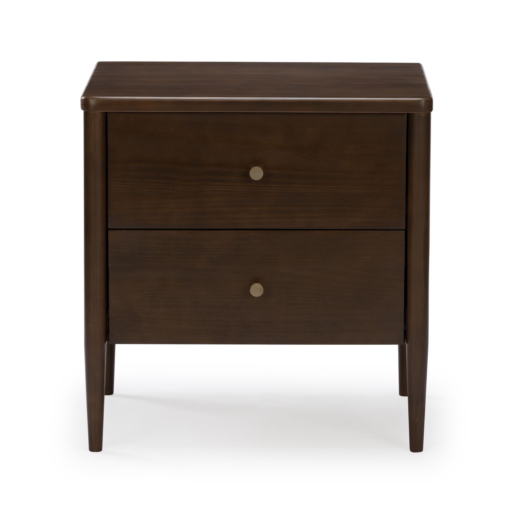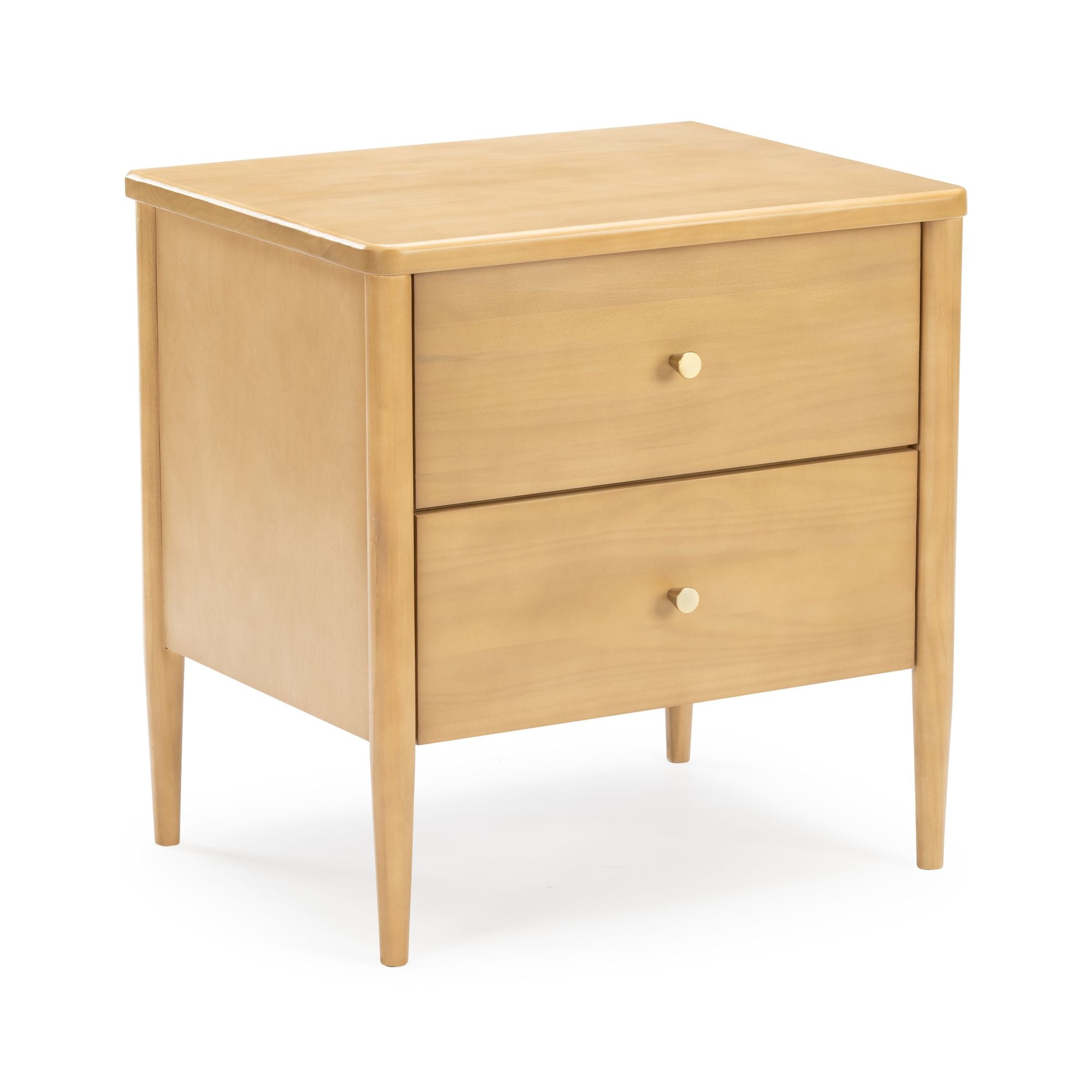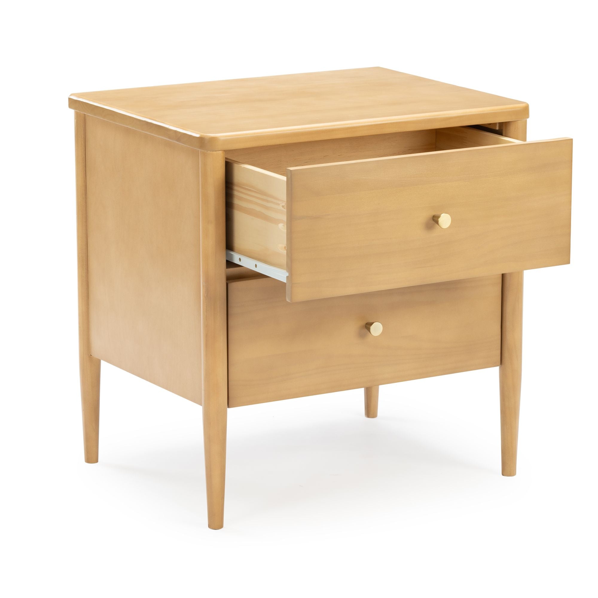 The Harbor 2-Drawer Nightstand brings mid-century charm straight to your bedside. Made from solid pine and engineered wood, this mid-century modern nightstand is built to last while letting the natural beauty of real wood shine through. Two spacious drawers keep your essentials tucked away, finished with antique brass pulls that add just the right touch of modern shine. Rounded, tapered legs ground the design with that iconic mid-century look. The result? A nightstand that’s functional, stylish, and easy to work into any bedroom setup.